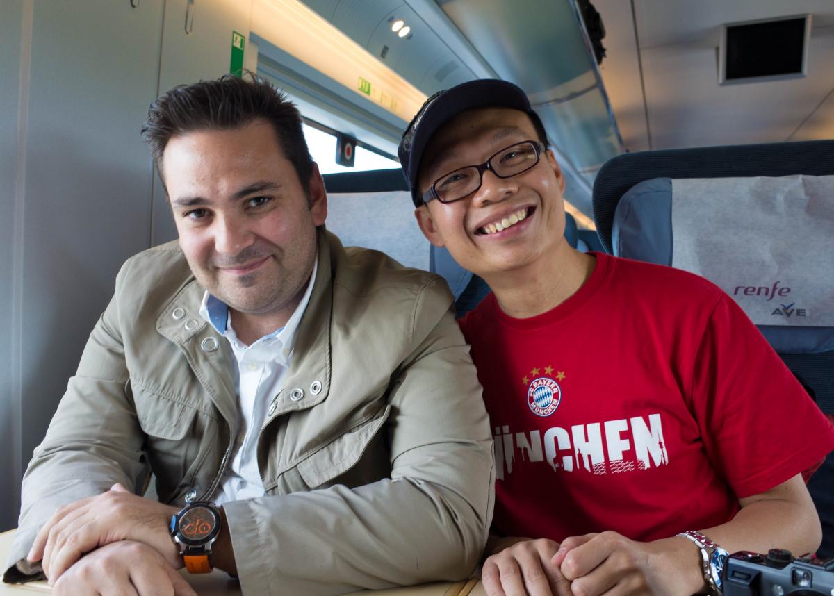 Als wir in Zaragoza per Anhalter nicht weiterkamen, stiegen wir in den Zug nach Madrid. Bald erschien wie aus dem Nichts eine etwas zappelige Gestalt in Hard-Rock-Cafe-Basecap und Bayern München-Trikot. Um seinen Nacken war eine Kamera geschlungen, und er haschte so intensiv nach menschlicher Erwiderung, dass man ihn nicht angucken konnte, ohne Augenkontakt aufzunehmen. Das war Derek, ein Versicherungsvertreter aus Malaysia. „Where are you from?“ fragte er in seinem, wie sich schnell herausstellte, sehr fließendem Englisch.