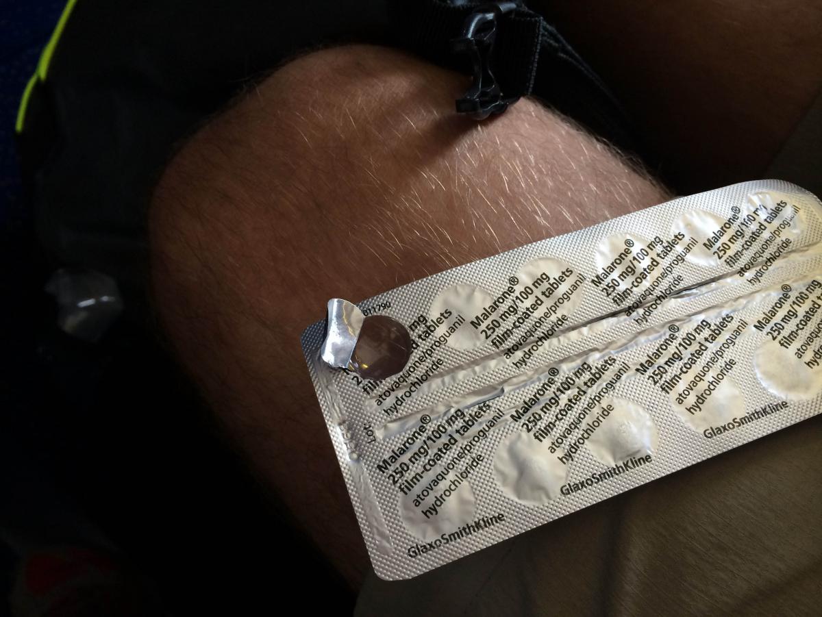 Mmm, lecker Malarone... Ab jetzt pro Tag eine Tablette bis zu einer Woche nachdem wir das Malaria-Gefahr-Gebiet verlassen haben.