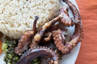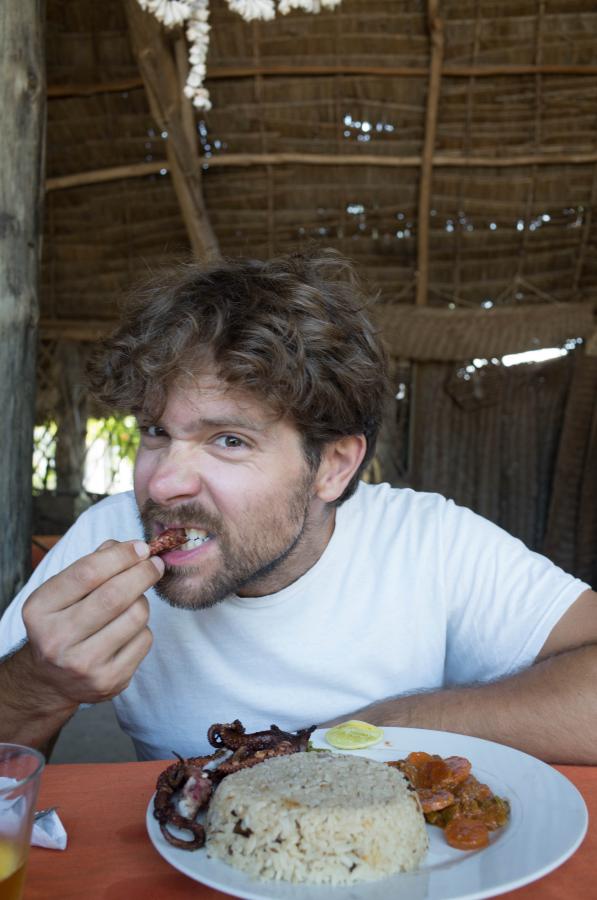 Diese Meeresfrucht hat John selber aus dem Ozean gepflückt (nachdem Aji sie mit der Speer schon aufgespießt hatte). Die Gewürze auf Sansibar sind einmalig, aber da John schon am vorigen Tag Oktopus-Curry gekostet hatte, entschied er sich diesmal, den Krake gegrillt zu essen. Er meint, es sei die richtige Entscheidung gewesen.